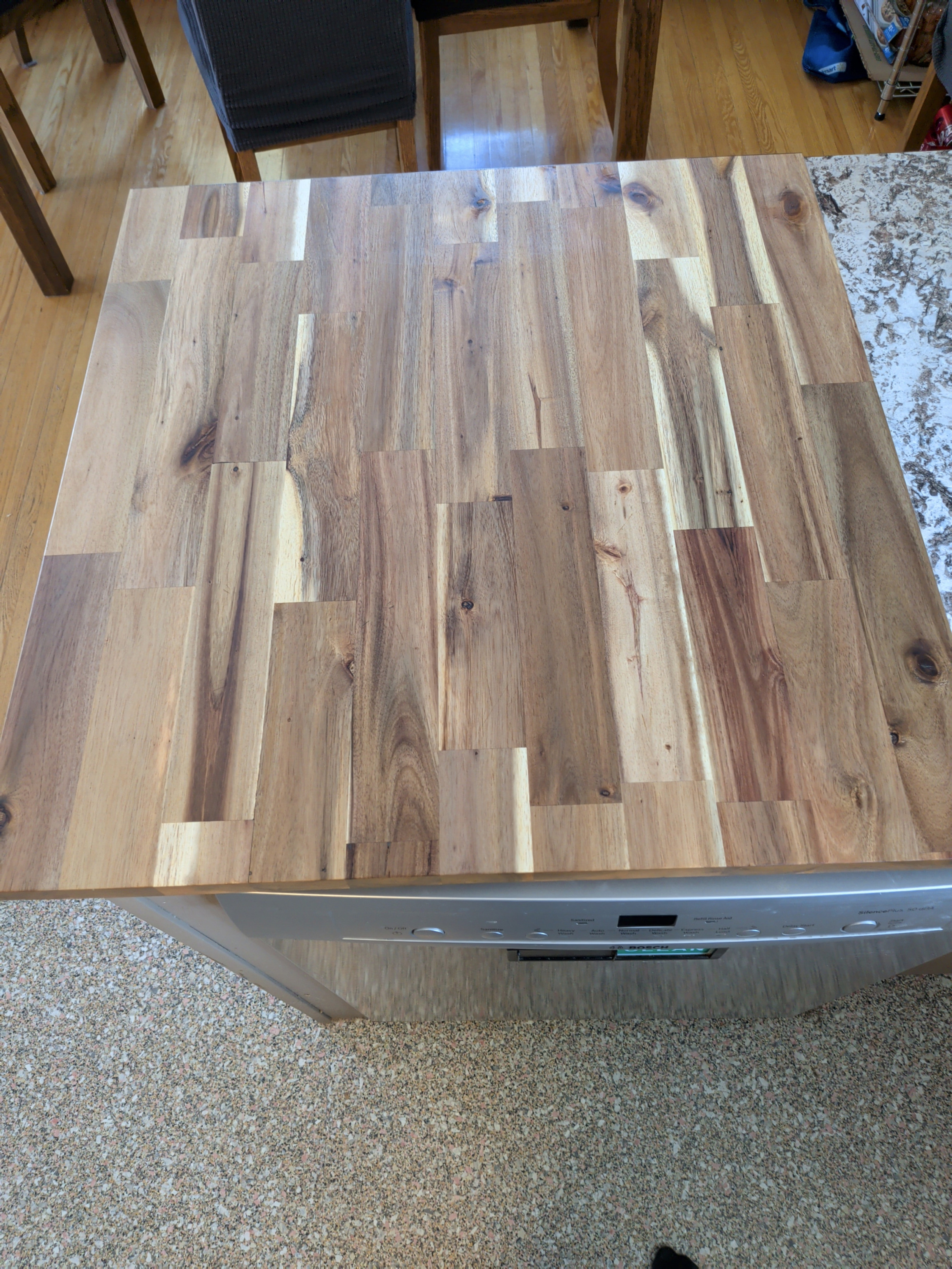 A useful and beautiful cutting board counter top installed above a dishwasher. This one is sure to get its use!